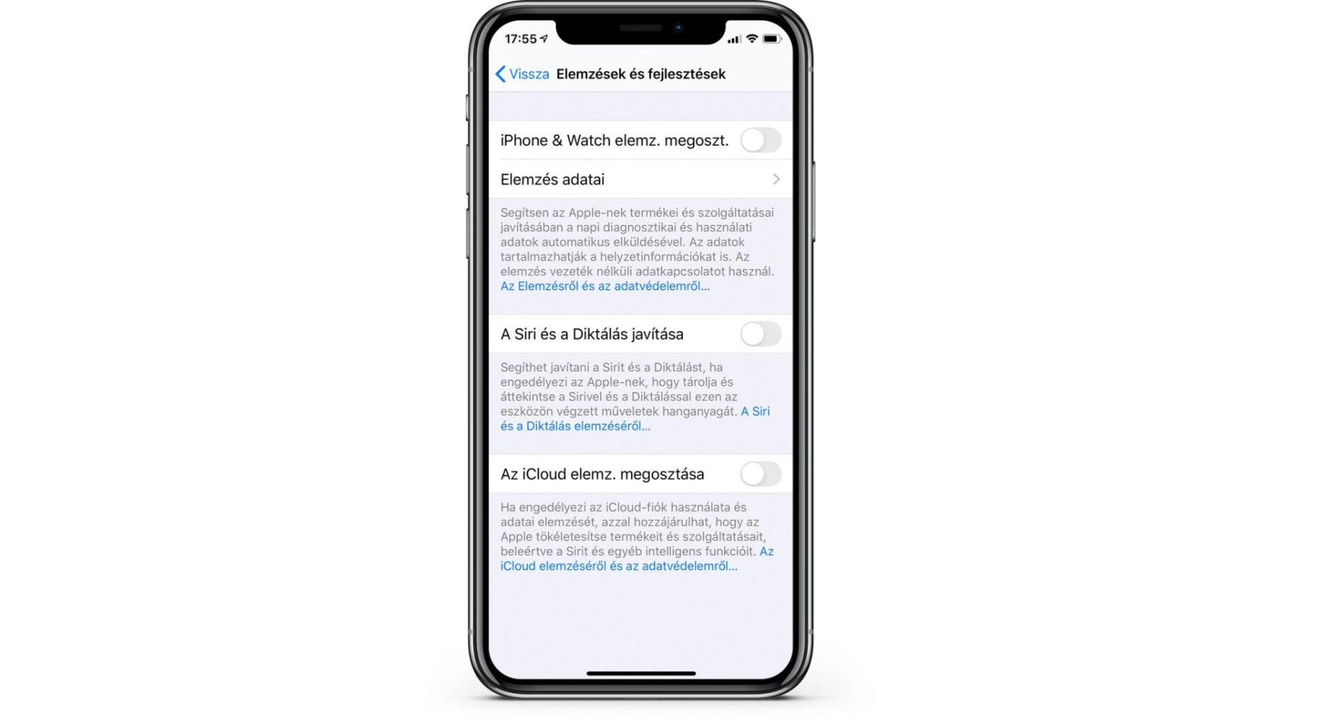Ezeket az Adatvédelem > Elemzések és fejlesztések fülnél találjuk legalul. Itt első pillantásra jópár opció érhető el, viszont ha a legfelsőt (iPhone & Watch elemz. megoszt.) balra állítjuk már is csak 3 sor kacsingat vissza ránk. Érdemes a többit is inaktívvá tenni.