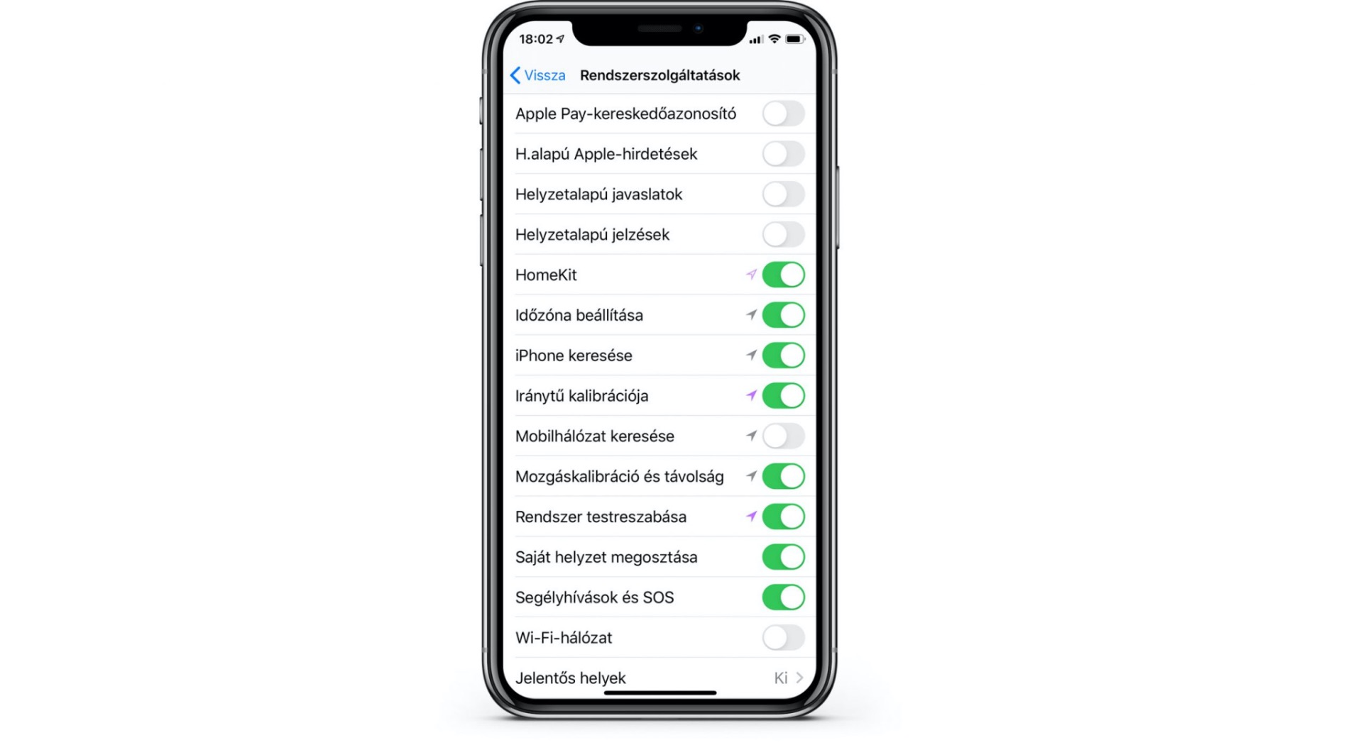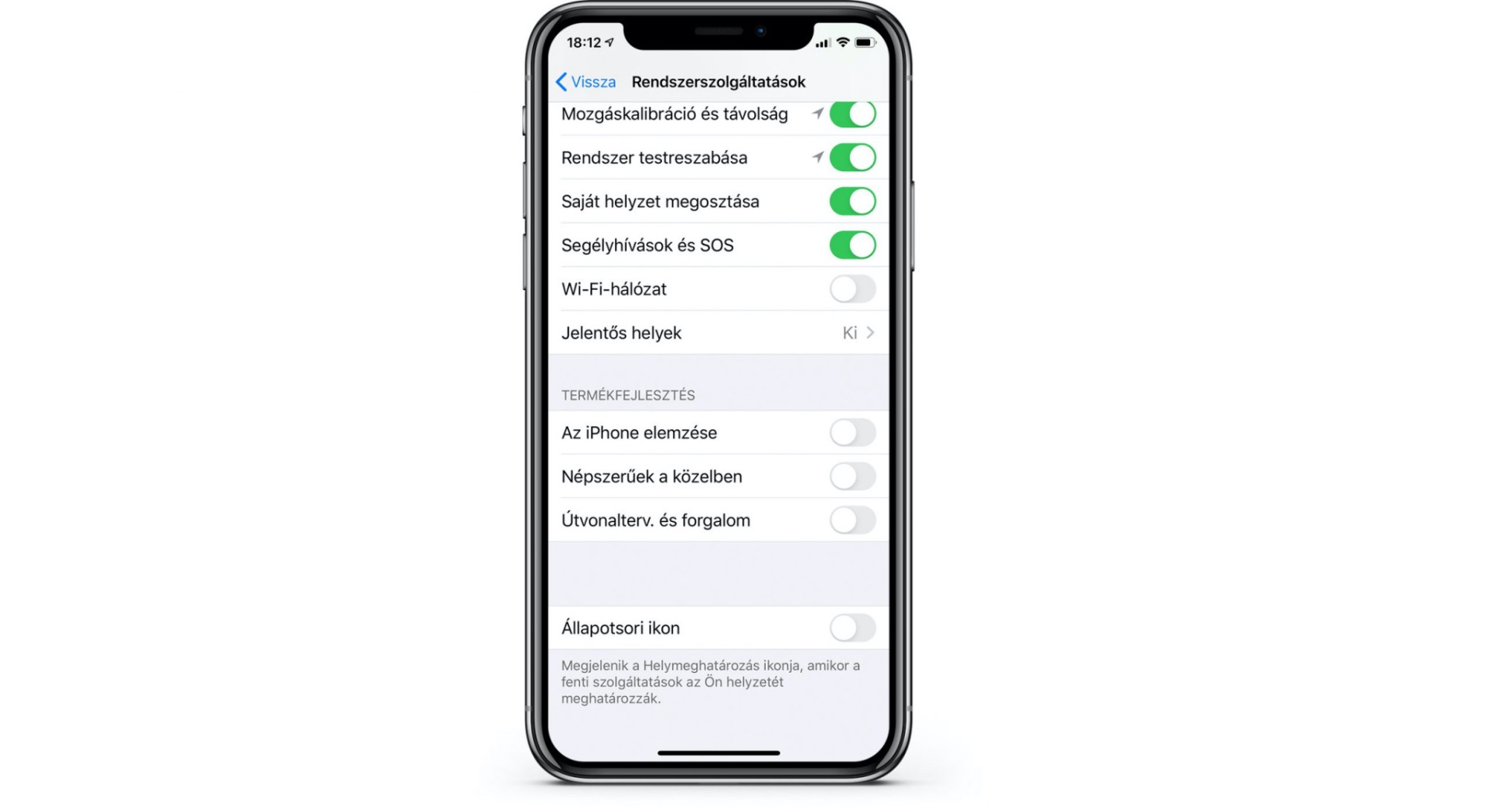 Ennek a menünek az alján lévő Rendszerszolgáltatásokra bökve megleshetjük az Apple milyen esetekben nézi aktuális helyzetünket. Itt azért érdemes nem olyan nagy lendülettel nekiesni a kapcsolóknak, hiszen számos tényező fontos lehet a napi használatkor.