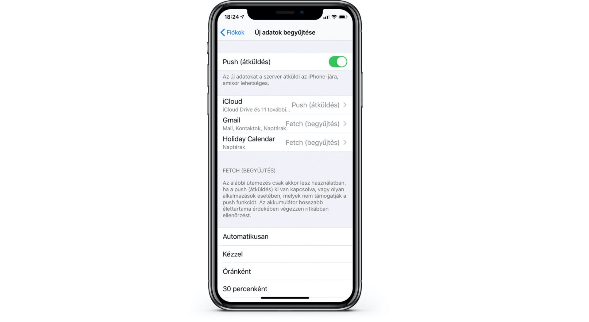 A Push folyamatosan éber és amint jött egy új email már jelez is felénk. Vagyis ő eszi a legtöbb energiát és adatforgalmat. A Fetch ennél egy jóval barátságosabb faj, mivel itt beállíthatjuk, hogy milyen időközönként nézzen körbe, érkezett-e új email.