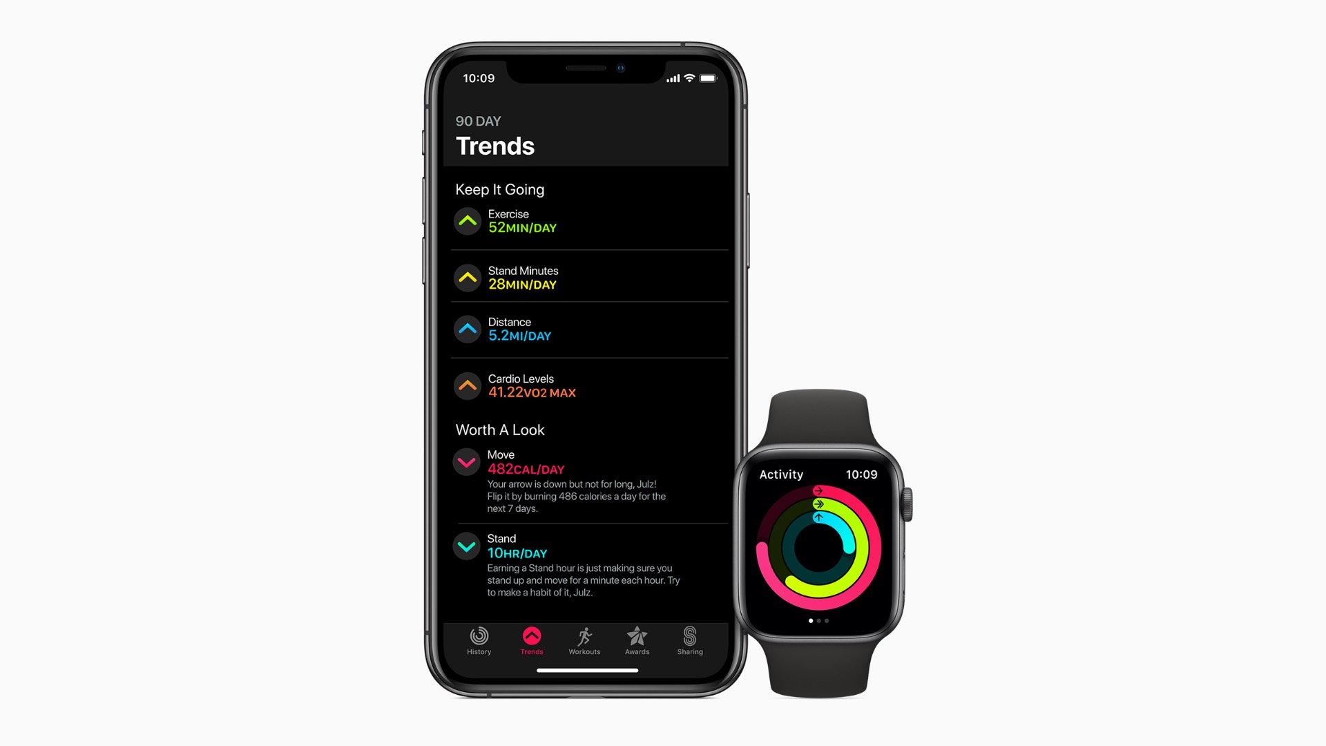 - Aktivitás trendek – a napi körök jelzése mellett visszanézheted az elmúlt időszak teljesítményét, és jobban átláthatod, milyen aktív életet élsz.