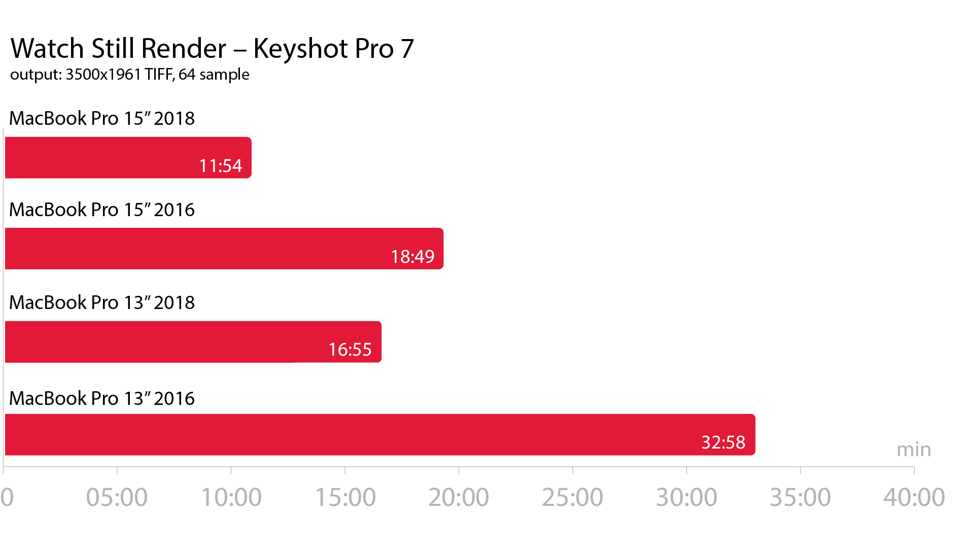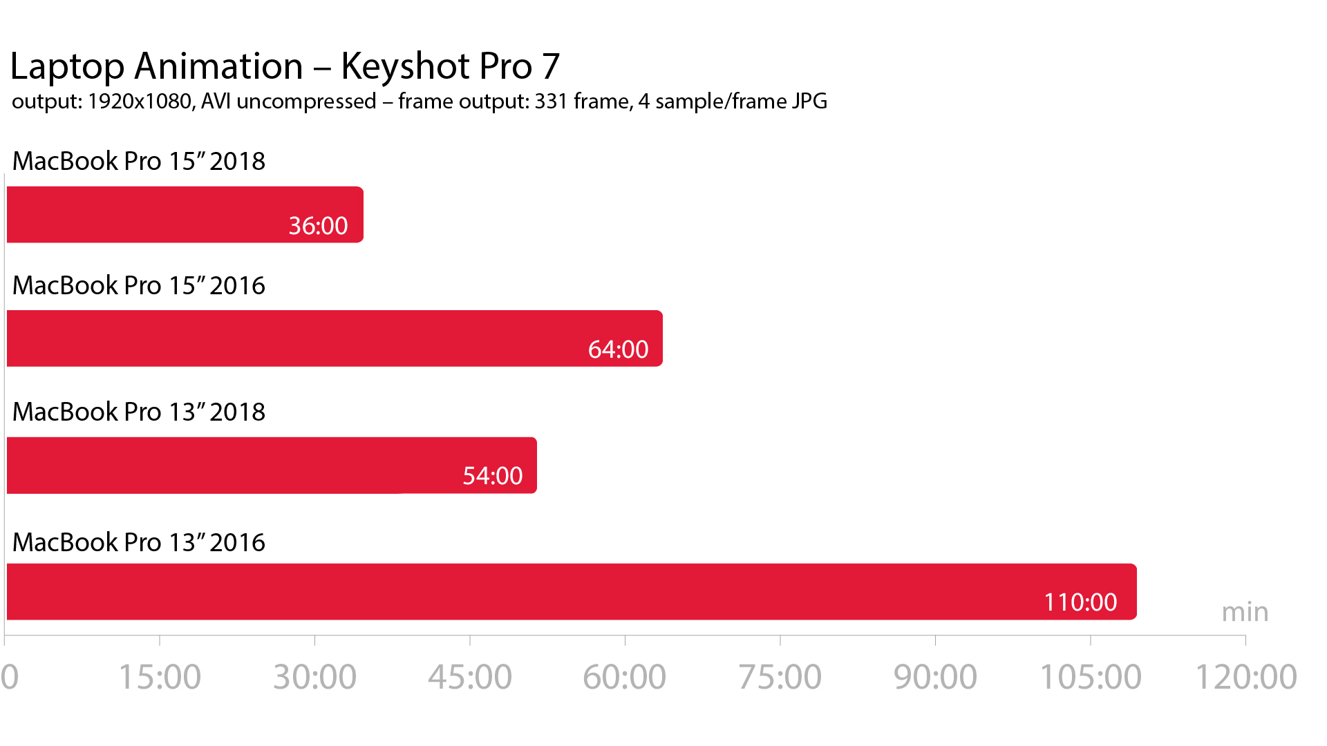 Ahogy az a grafikonon is látszik arányosan közel ugyanazt az eredményt kaptuk, mint az állóképes összehasonlításban. Mind a négy gépnek egy 331 képkockából álló, Full HD animációval toltuk ki a szemét, framenkénti 4 mintavételezéssel. Az új modellek között 50%-os, a 15″-esek között 78%-os, a régi 15″-es és az új 13″-es között pedig 19%-os eltérést kaptunk utóbbi javára. Ebben az összehasonlításban ez a modell ismét kétszer olyan gyors volt, mint 2016-os elődje.
