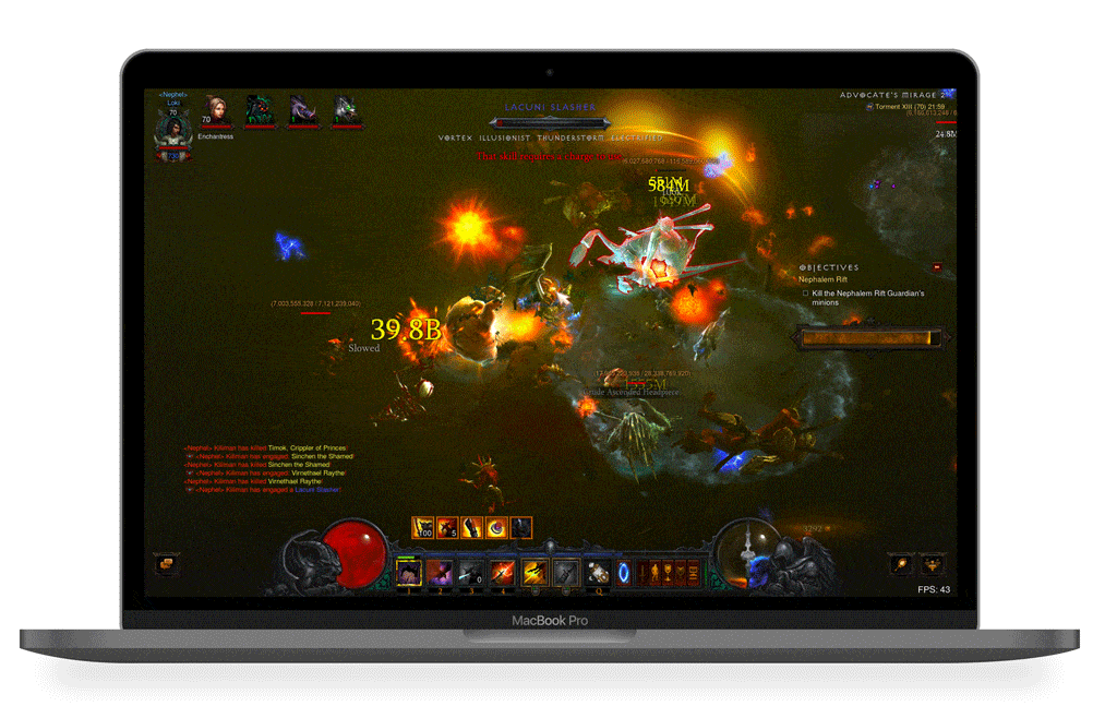 Miután ezzel végeztek a gépek, pihenés képen egy kis Diablo III-mal jutalmaztuk magunkat. Teljesen adhoc módon jött az ötlet, hogy mi lenne, ha megnéznénk, mire számíthat egy játékos az Apple új notebookjaitól. Az is felmerült bennünk, hogyha valaki egy ilyen értékú számítógépet vásárol, annak lehetnek igényei gaming felhasználásra is. Bár tudjuk, hogy a Macek egyáltalán nem erre lettek kitalálva, sosem kapják meg a piacon elérhető legerősebb videokártyákat, de milyen jó lenne ha mégsem kellene külön PC-t vagy konzolt vásárolni egy esetleges könnyed játékra.