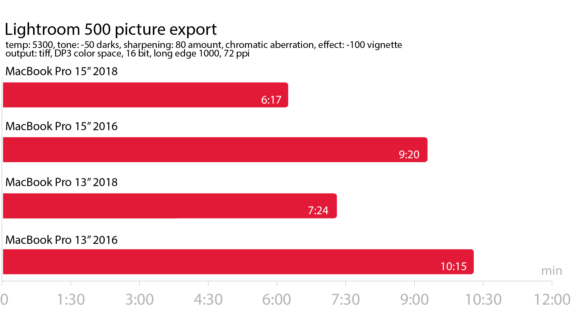 A leggyakrabban használt korrekciókat alkalmaztuk: színhőmérsékletet, színtónust, élesítést, kromatikus aberrációt és vignettálást állítottunk. Az export beállításoknál 16 bites tiff formátumot adtunk meg DP3-as színkezeléssel, long edge 1000 72ppi értékekkel. Ebben az esetben is fölényesen nyert az új 15″-es modell, a tavaly előttivel szemben 49%-os volt az eltérés. Ezúttal is az új 13″-es végzett a második helyen, saját súlycsoportjával szemben 40%-kal, ugyan régebbi de nagyobb vetélytársával szemben 27%-kal volt fürgébb. Ebben az összehasonlításban már valamelyest kisebb arányú volt az új gépek fölénye, de még mindig jelentős maradt.