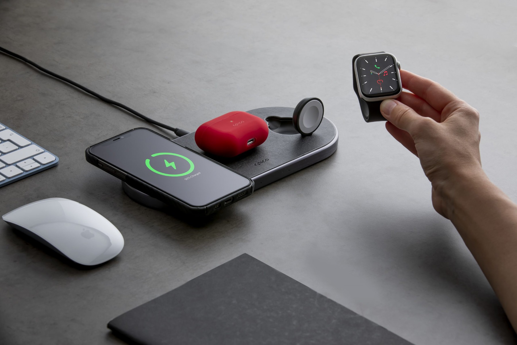 A 3 az 1-ben vezeték nélküli töltőállomás nagyszerű megoldás akár 3 eszköz egyidejű töltésére. Képes akár 7,5 és 10W gyorstöltéssel tölteni az iPhone készülékedet, míg az Apple Watch-ot ezzel egyidőben 5W teljesítménnyel tudja tölteni. A töltő minimalista külsejével is magára hívja a figyelmet, a bőr és az alumínium borításának köszönhetően. A csomagban továbbá egy 30W-os QC fali adaptert is találsz.