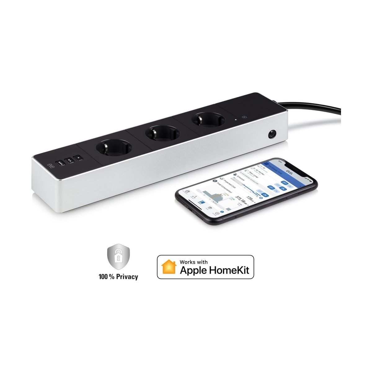 Az Eve elosztó három konnektorát (és a csatlakoztatott készülékeket) külön-külön vezérelheted egy iPhone-app vagy Siri segítségével. Az elosztó túláram és túlfeszültség elleni funkciókkal védi készülékeidet. Ráadásul az összesített energiafogyasztásukat is nyomon követheted.